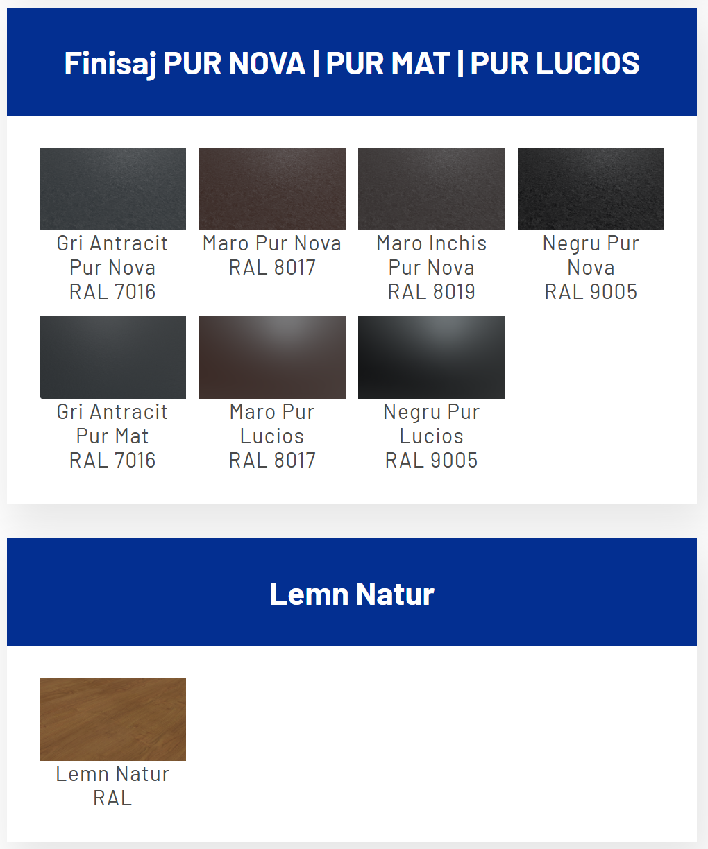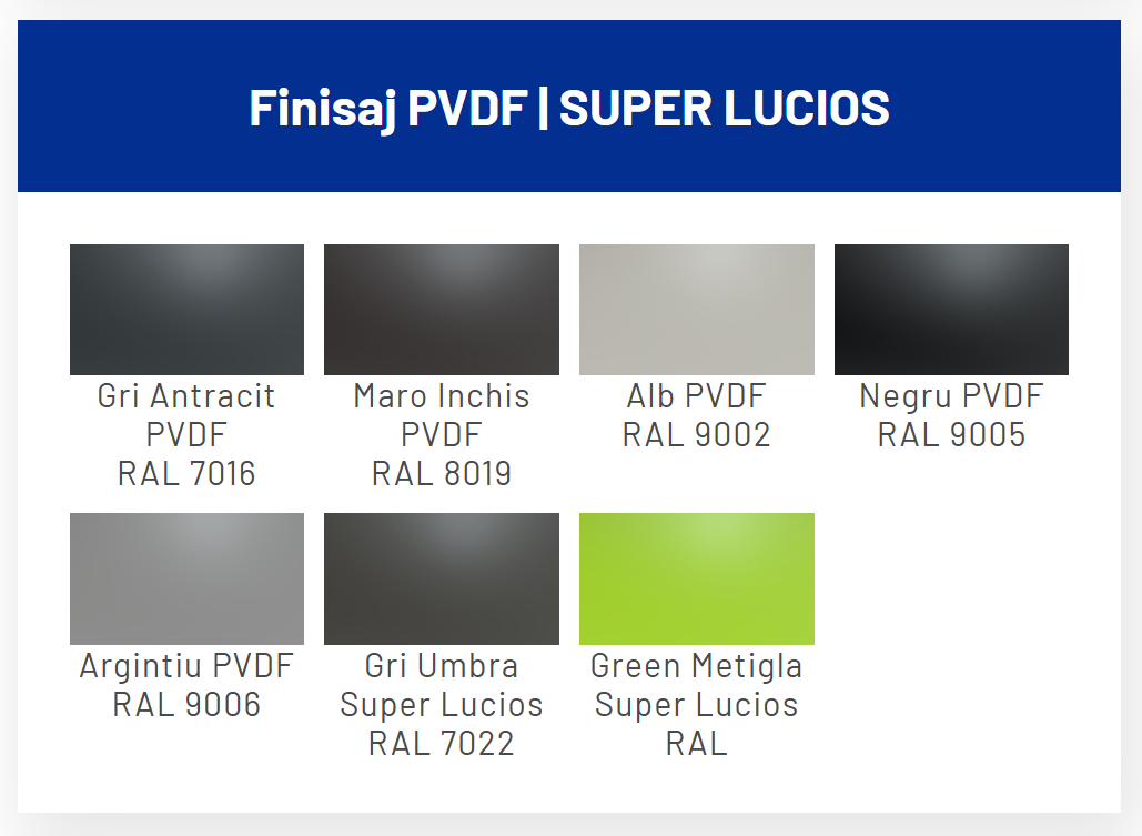 | TIP PRODUS | ACOPERIRE VOPSEA | Polyester Lucios 25µm | Super Matt 35µm | PVDF 25µm | PurNova 55µm |